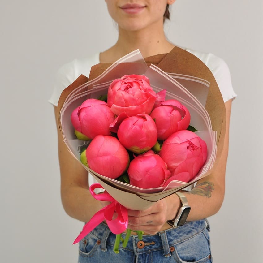 Букет из 7 коралловых пионов - прекрасный подарок, который непременно подарит улыбку и хорошее настроение на весь день!