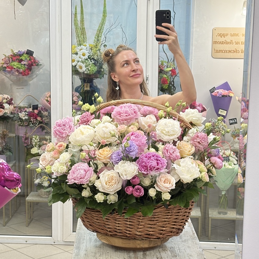 Объём корзины позволяет собрать поистине впечатляющую композицию — десятки бутонов создают роскошный букет, который становится центром внимания в любом интерьере. Благоухающий аромат наполняет пространство нежностью и романтикой.