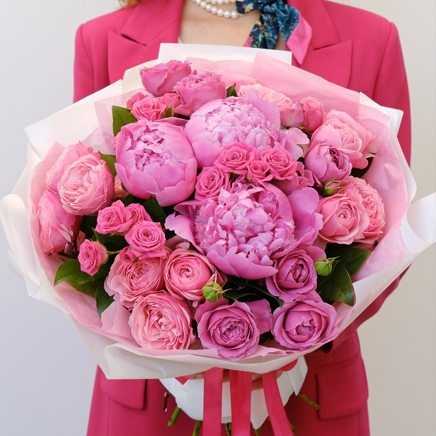 Пионы и пионовидные розы в букете "Тайна розового ветра"