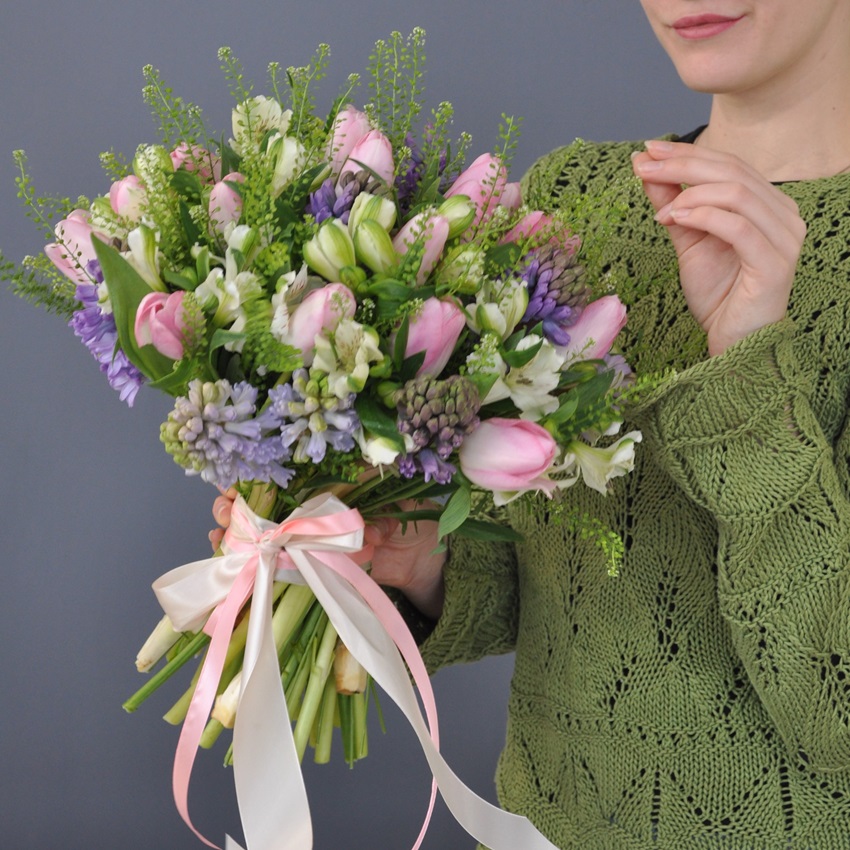 Чудесные гиацинты, голландские тюльпаны, альстромерии и декоративная зелень.