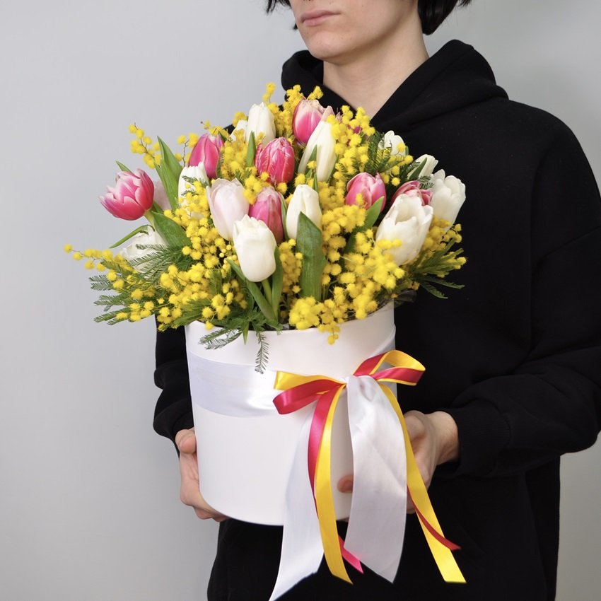 Мимоза и тюльпаны в коробке