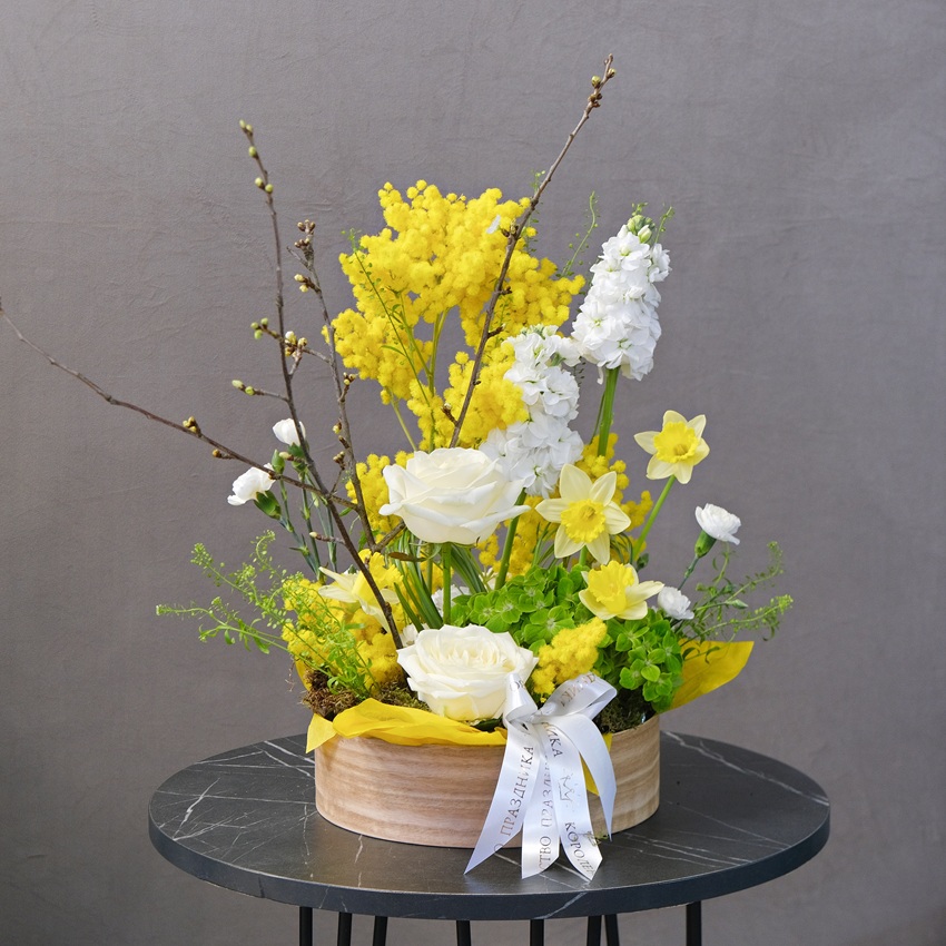 Нарциссы и мимоза в весенней композиции в кашпо "Золото весны"
