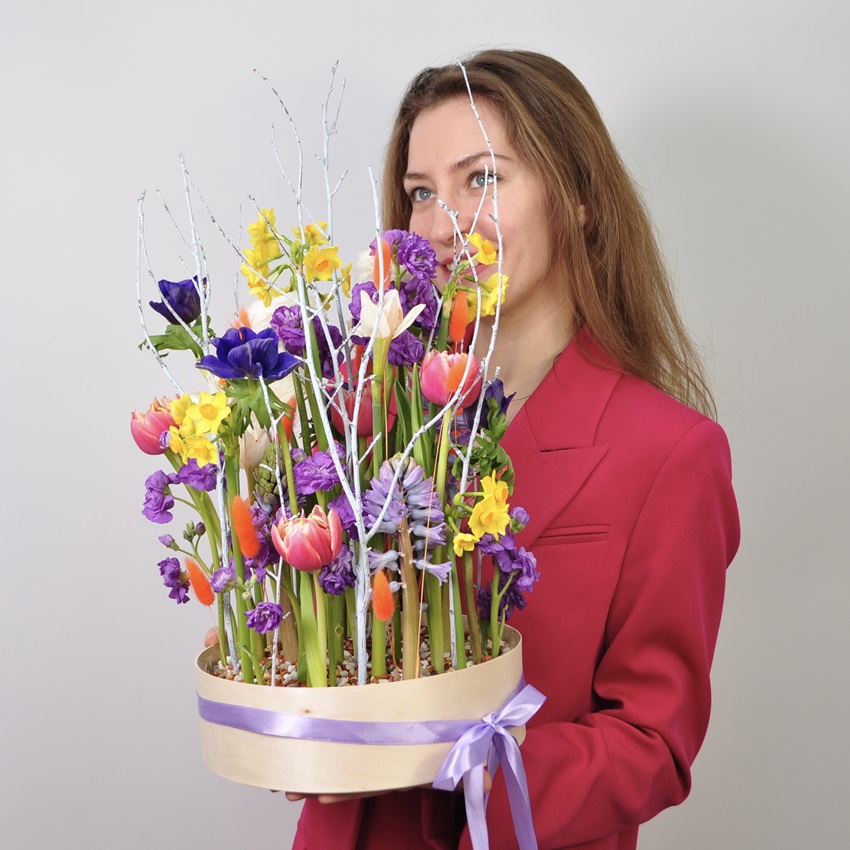 Фантастическая, яркая композиция с весенними цветами: нарциссы, тюльпаны, гиацинты, анемоны.