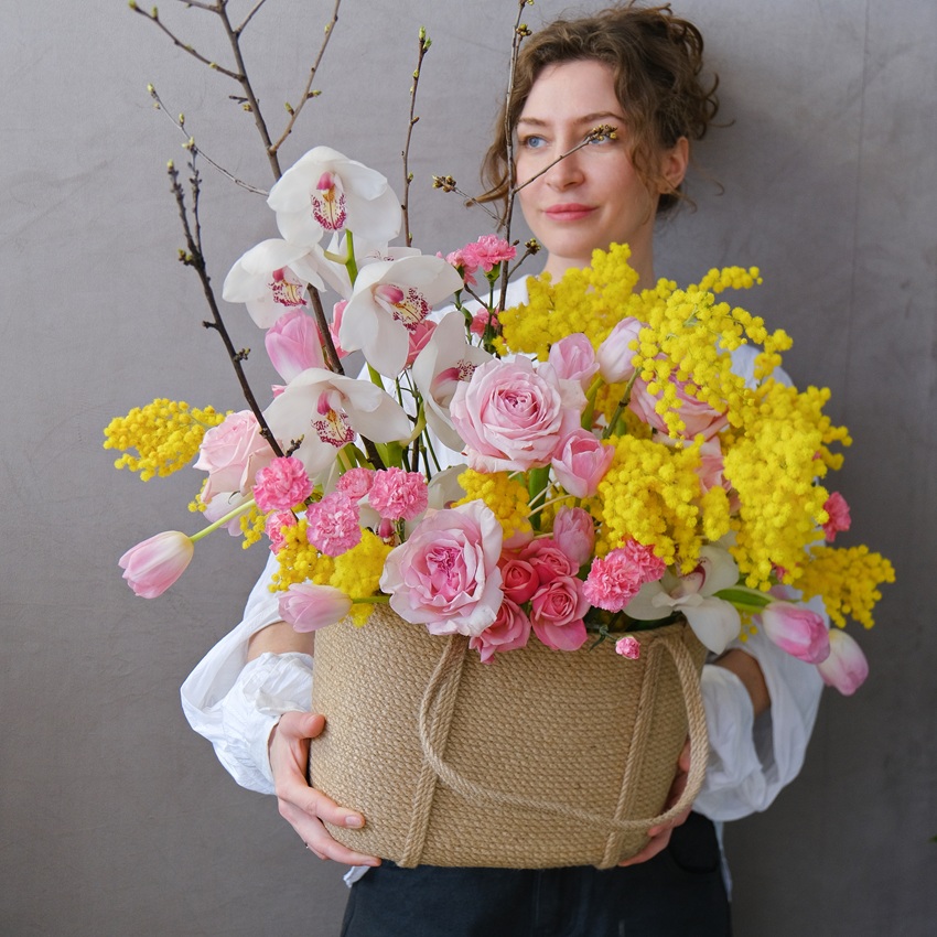 Букет собран в корзине, цветы установлены в специальную флористическую пену - оазис. Необходим ежедневный полив.