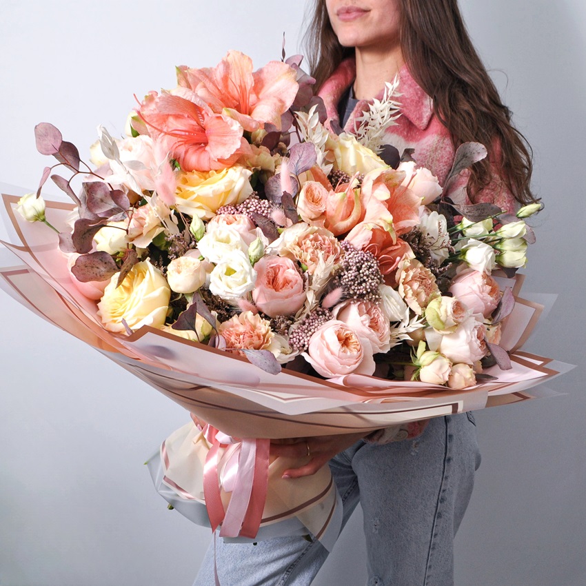 Амариллисы и пионовидные розы в букете «50 оттенков нежности»