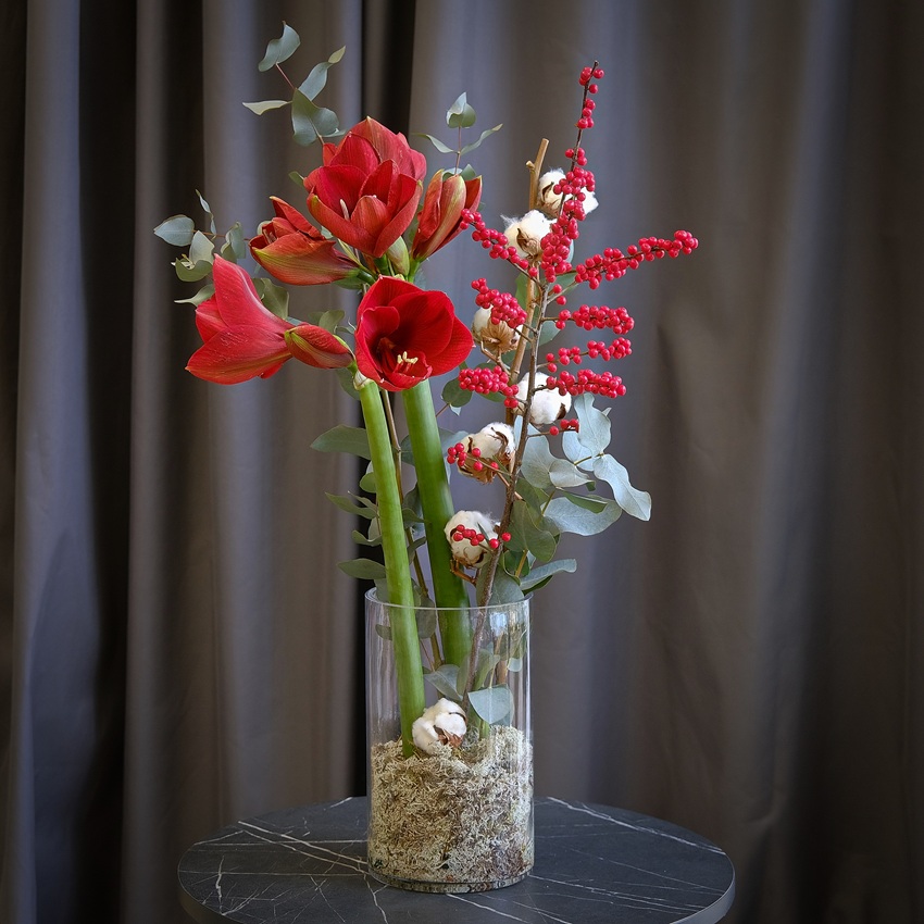 Амариллисы, илекс и хлопок в стеклянной вазе