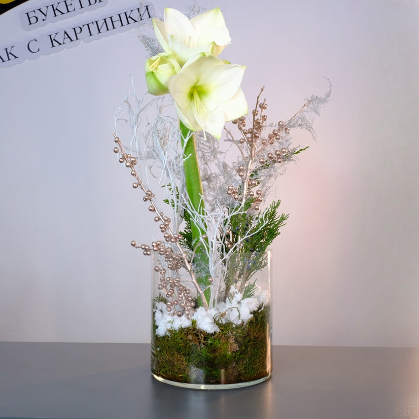 Зимняя композиция с белым амариллисом в стеклянной вазе.