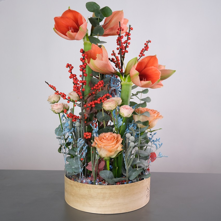 Фантастическая композиция с сезонными цветами: персиковые амариллисы, ягоды илекса, пионовидные розы и декоративная зелень.