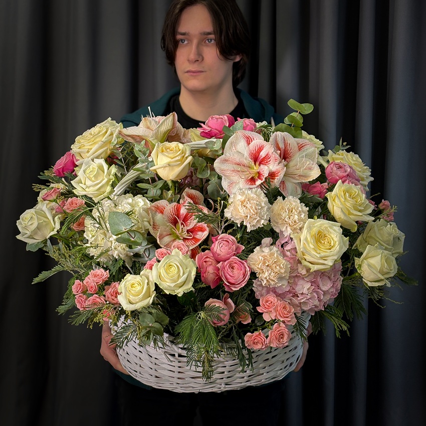 Розовые амариллисы и пионовидные розы в большой корзине