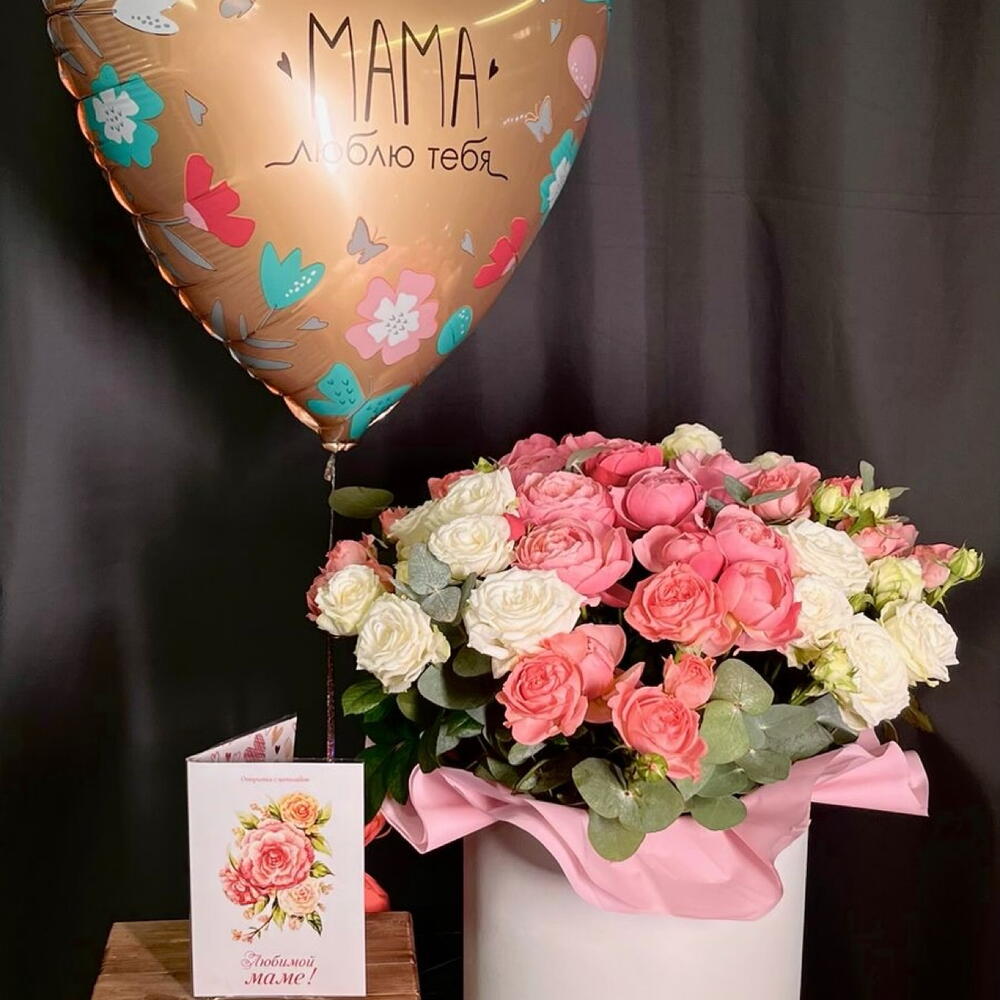 Сет на День Матери «Мамина нежность»: композиция с пионовидными розами, шар-фольга и открытка с шоколадом