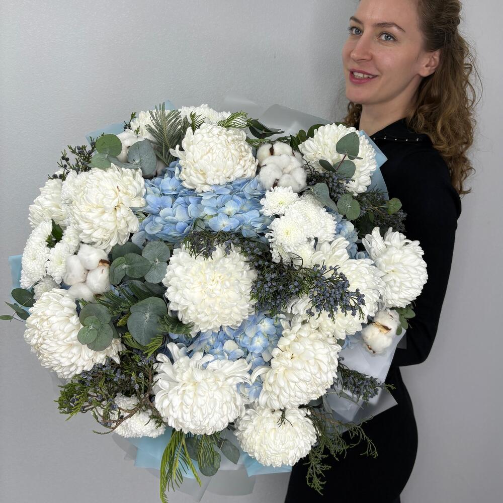 Белая хризантема и голубая гортензия в букете «Парящая нежность»