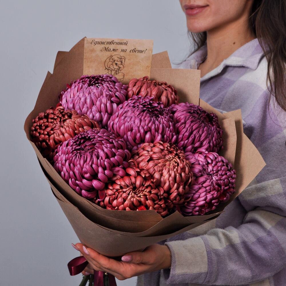 Изысканные сезонные хризантемы сорта бигуди в шоколадном и винном оттенках — настоящая симфония цвета и текстуры. Каждая хризантема в этом букете словно создана для того, чтобы привнести в ваш день атмосферу уюта и тепла.