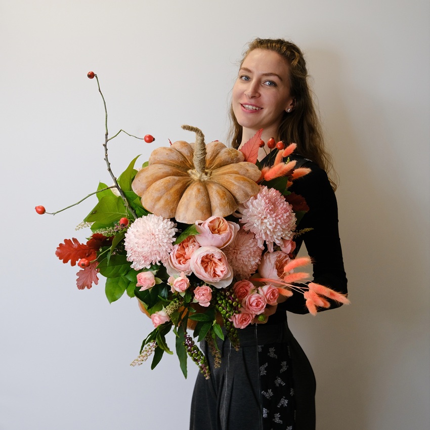 Шикарный осенний подарок: цветочная тыковка с хризантемами и пионовидными розами