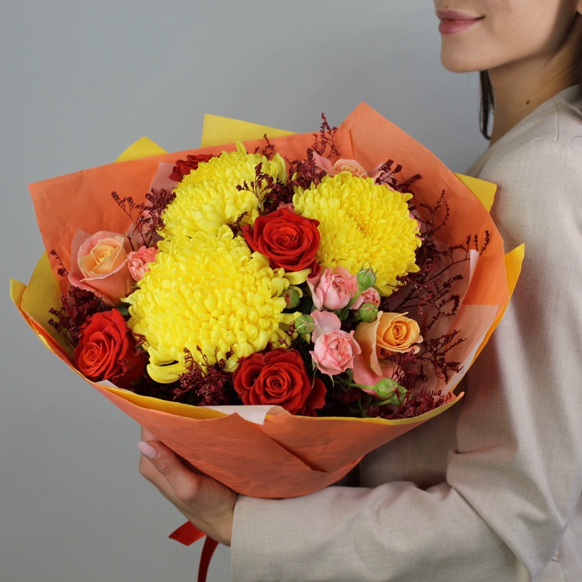 Яркий сочный букет с жёлтыми хризантемами и розами.Необыкновенно позитивное сочетание красных, персиковых и жёлтых оттенков поднимает настроение и положительно влияет на душевное равновесие!