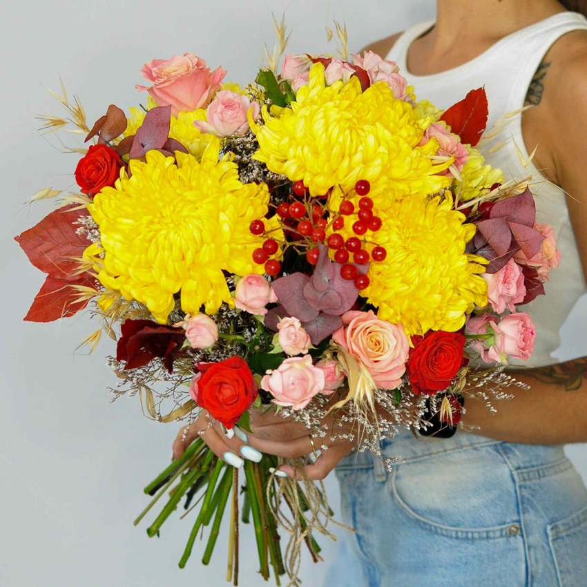Букет с хризантемами, ягодами калины и российскими ароматными розами подарит осеннее настроение вашему получателю.