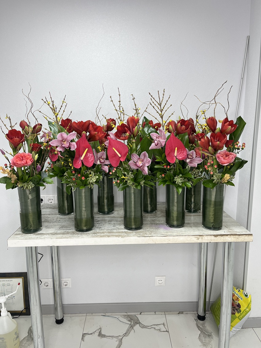 Букеты с амариллисом и антуриумами в стеклянных вазах