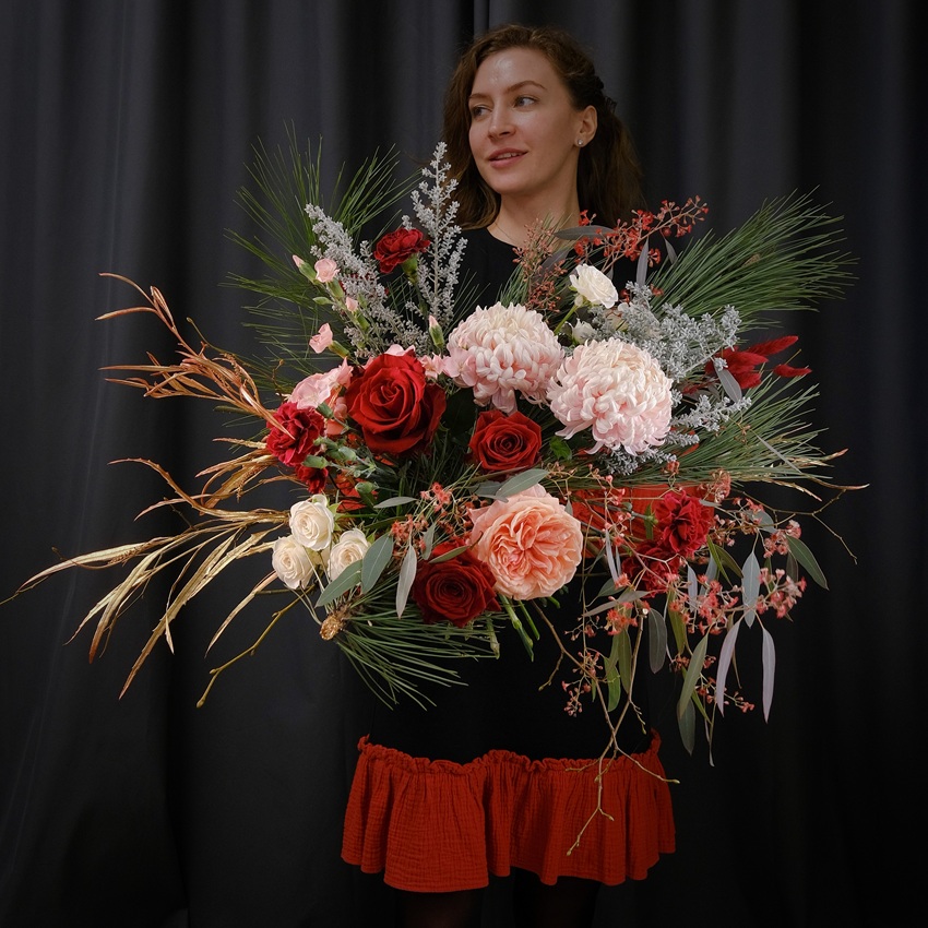 Авторский зимний букет с розами, сосной и декоративными веточками