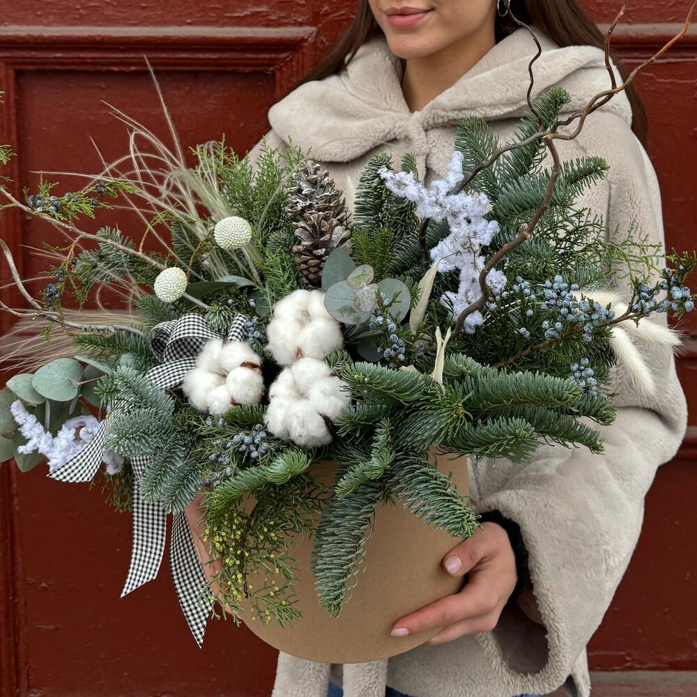 Композиция сделана без увядающих элементов. Каждый элемент декора предназначен для зимнего созерцания долгих три месяца.