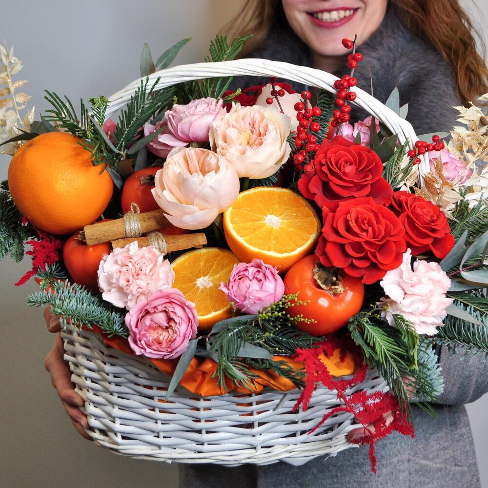 Яркая сочная цветочная корзина с сезонными фруктами и пионовидными розами.
