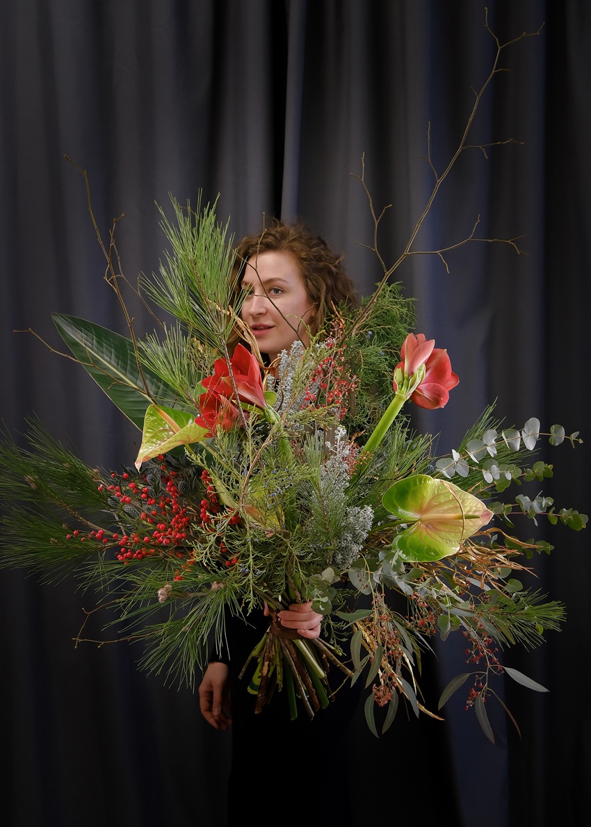 Креативный букет "Дикий взрыв". Зимняя история с ветками сосны, можжевельника и амариллисами