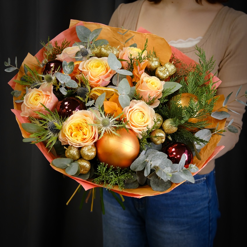 В составе пионовидные розы, эвкалипт, зимние колючки, дольки апельсина и сезонная хвоя!