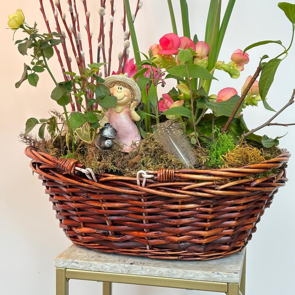 Бегония, цикламен, нарциссы, сувенир Девочка и веточки вербы в подарочной корзине на Пасху