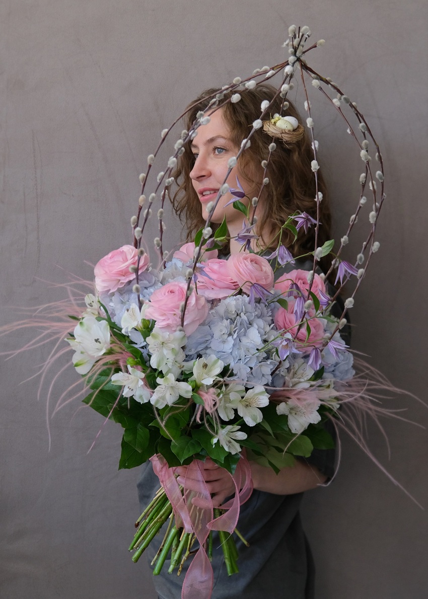 Букет на Пасху интерьерный: верба, ранункулюсы и гортензия