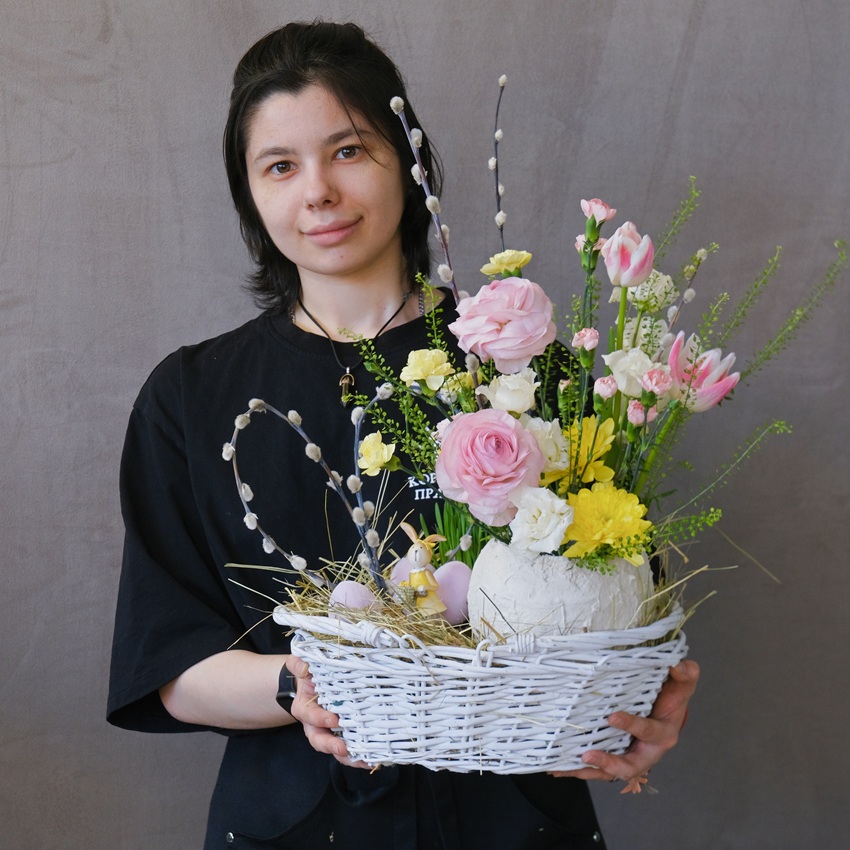 Букет на пасху в корзине с живыми цветами в яйце ручной работы