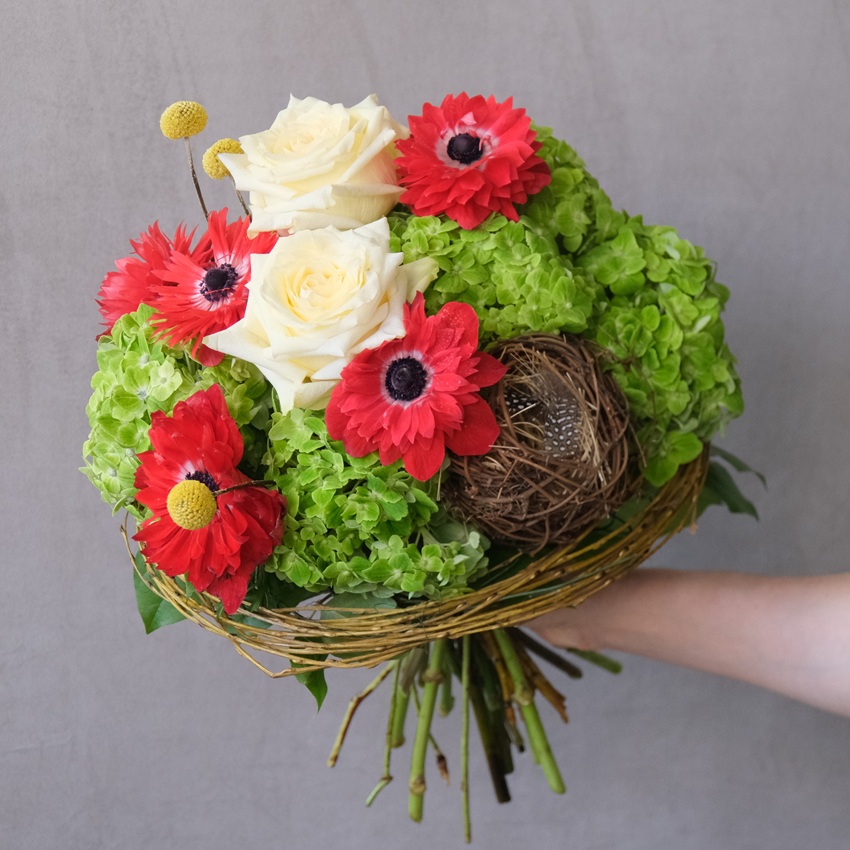 Гортензия и красные анемоны в букете на Пасху с декором