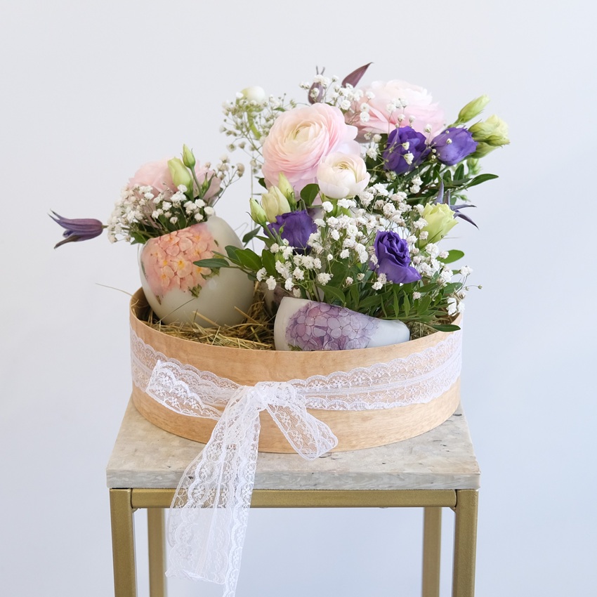 Яйца ручной работы с живыми цветами. Композиция выполнена в деревянном ящичке, яйца расположены на сене, а цветы установлены в специальную пену.