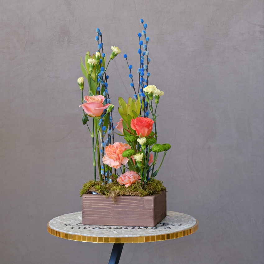 Композиция на Пасху в деревянном ящичке: голубая верба, розы и леукадендрон