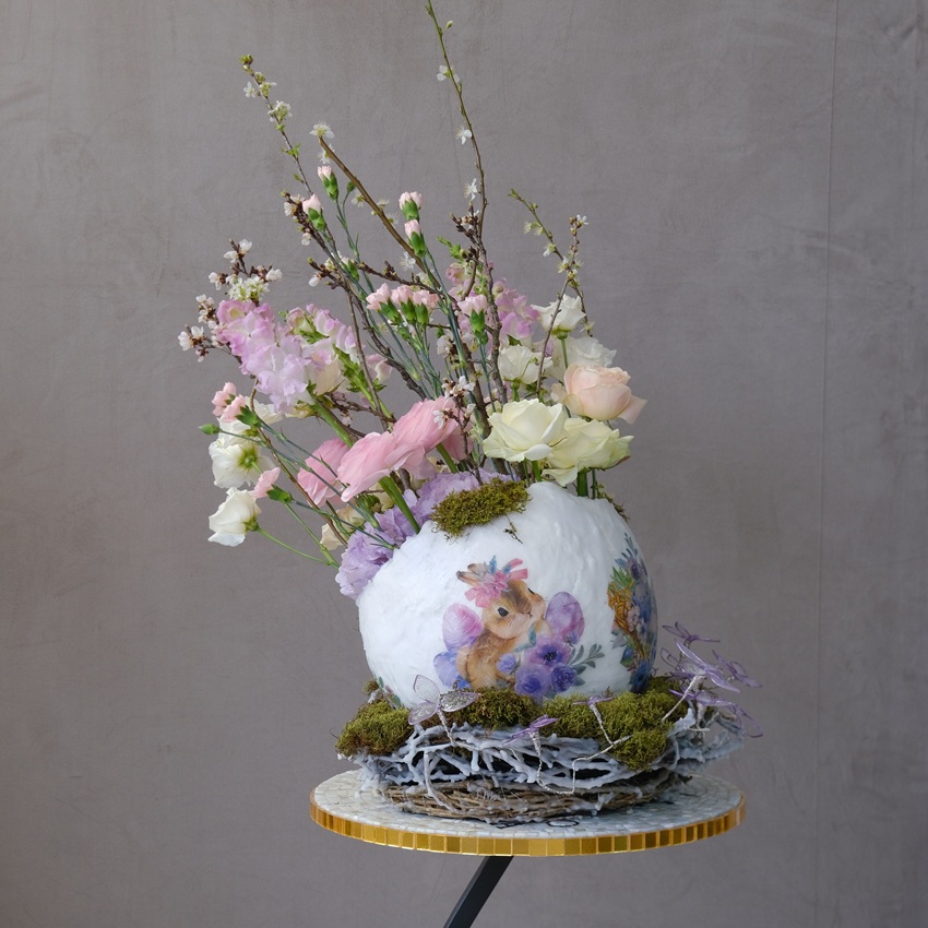 Ручная работа. Уникальное кашпо в форме яйца, созданное мастерами в единственном экземпляре, превращает этот подарок в настоящую драгоценность. Внутри — нежная композиция из живых цветов, символизирующая пробуждение жизни.