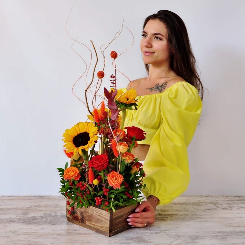 Интерьерная композиция с подсолнухами в ящике "Красочный натюрморт"