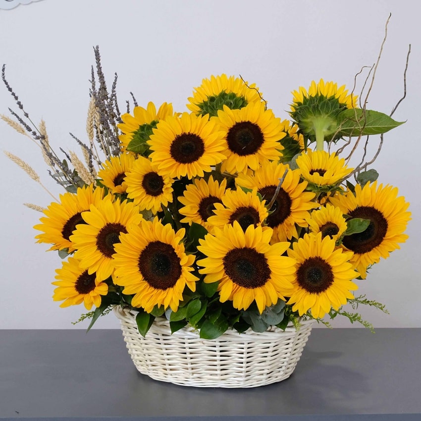 Этот букет — идеальный способ выразить свои чувства. Он прекрасно подойдет для любого случая: дня рождения, юбилея, свадьбы или просто как знак внимания и заботы. Букет в корзине с подсолнухами, лавандой и пшеницей способен поднять настроение и создать атмосферу праздника и уюта в любом доме.
