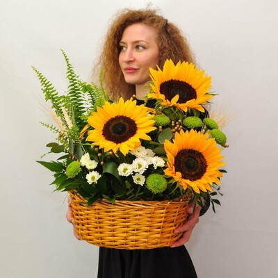 Лето в корзинке. Шикарные подсолнухи, океан зелени и нефролепис в горшочке