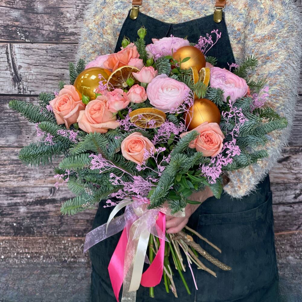 Шикарный подарок: ароматный зимний букет в розово - оранжевых оттенках.