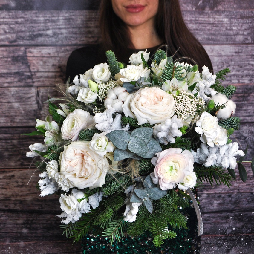 В составе ароматная датская ель нобилис, нежные ранункулюсы и пионовидные розы охара.
