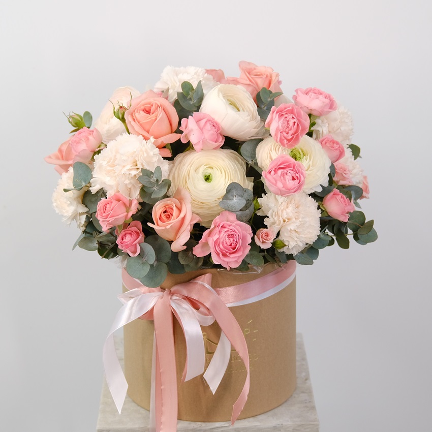 Нежная композиция из ранункулюсов и кустовых роз в шляпной коробке. В букете преобладают пастельные тона розового и белого.