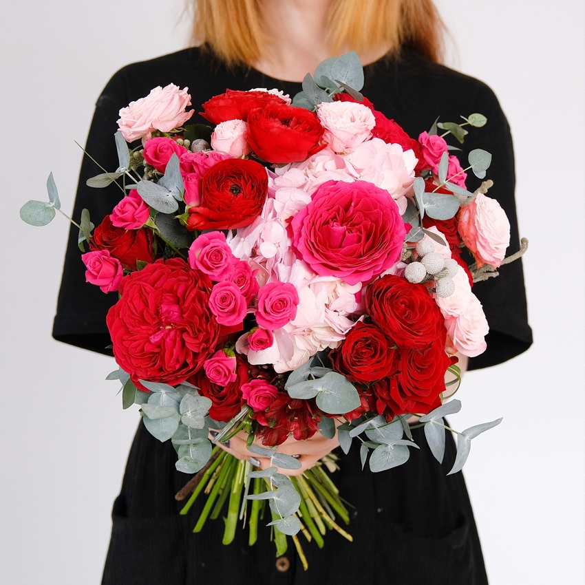 Ранункулюсы и пионовидные розы в ярком букете "Казанова"