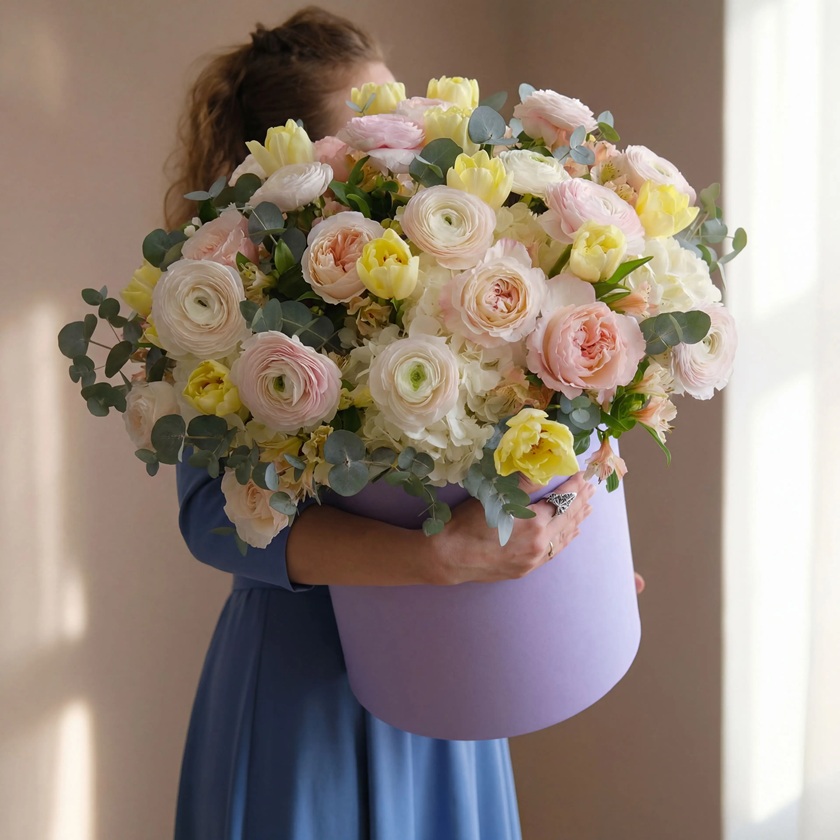 Композиция в коробке с пушистыми, будто сотканными из шёлка, ранункулюсами (лютиками) и элегантными тюльпанами.