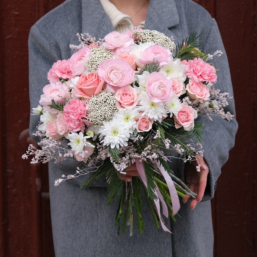 Букет собран без упаковки, в садовом стиле. Нежные хризантемы и кружевные ранункулюсы - это прекрасное сочетание, которое может стать очень красивым акцентом в интерьере или замечательным подарком.