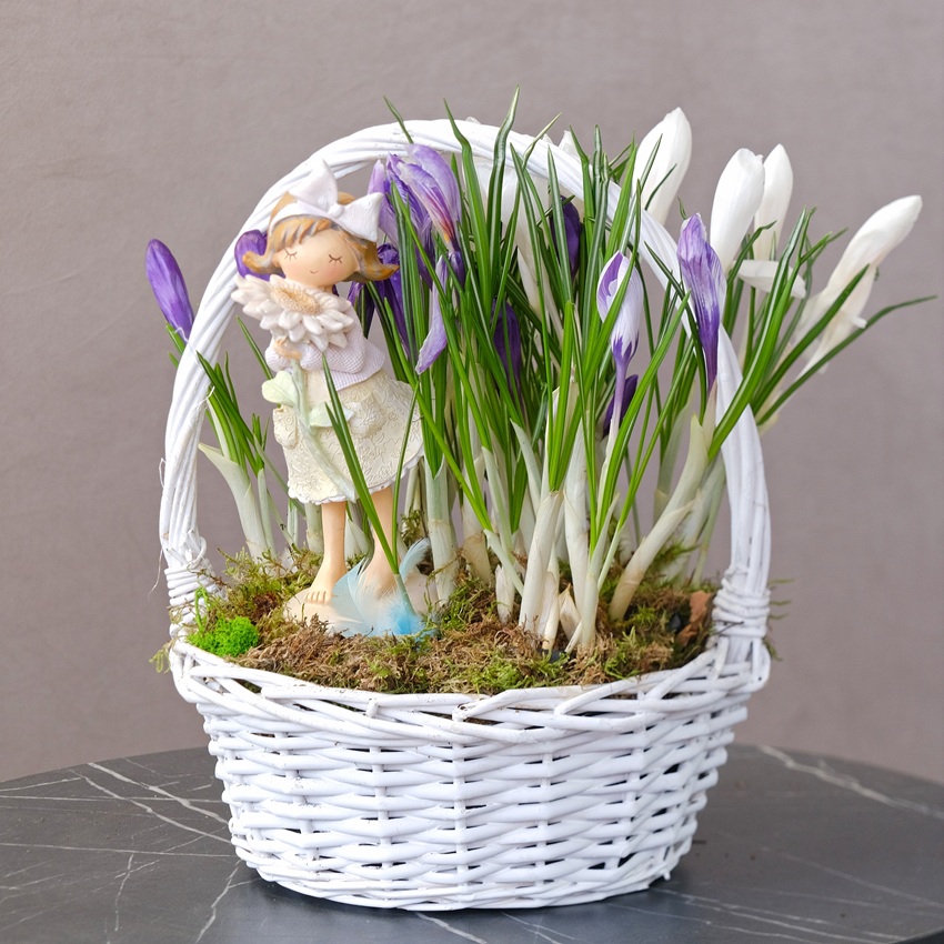 Садик с первоцветами (крокусы) и сувениром в корзинке "Девочка с цветком"