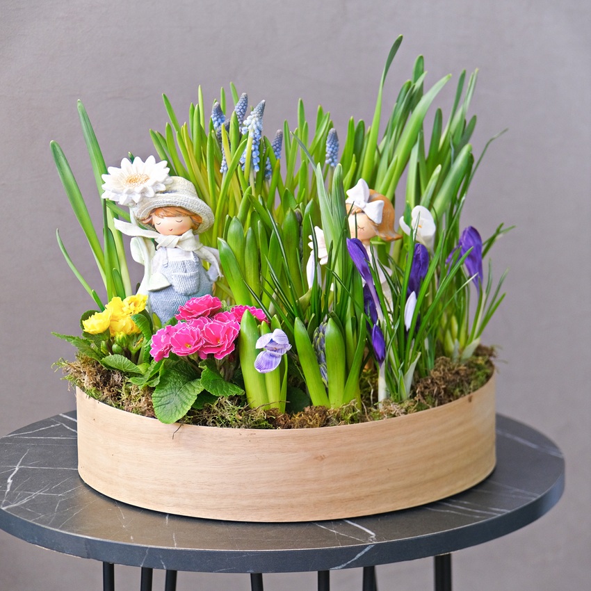 Композиция выполнена из луковичных цветов на грунте - необходим полив.