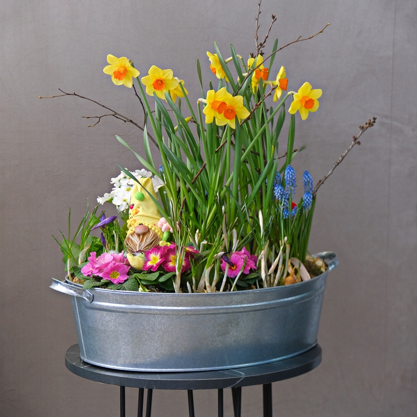 Встречайте главного героя сезона — гнома в солнечном колпаке! Он принес с собой целый сад первых цветов, собранных в стильном металлическом тазу.
