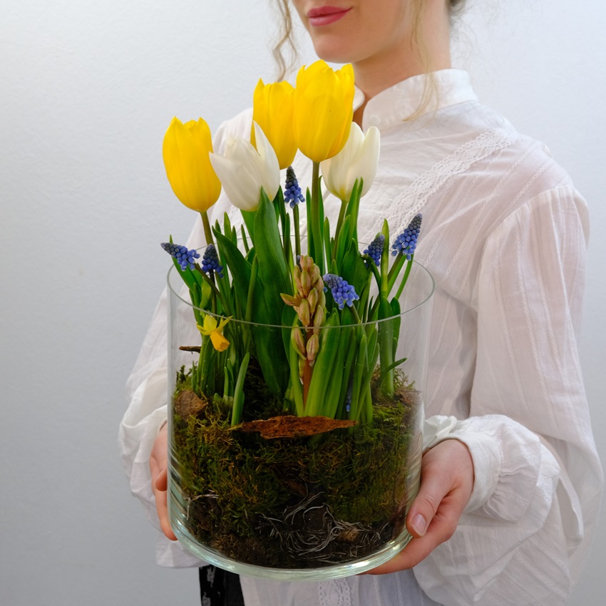 Садик с первоцветами: тюльпаны, мускари и нарциссы в стеклянной вазе