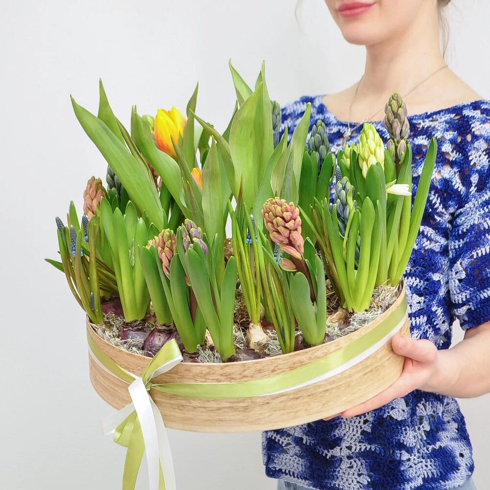 Композиция выполнена из луковичных цветов на грунте - необходим полив.
