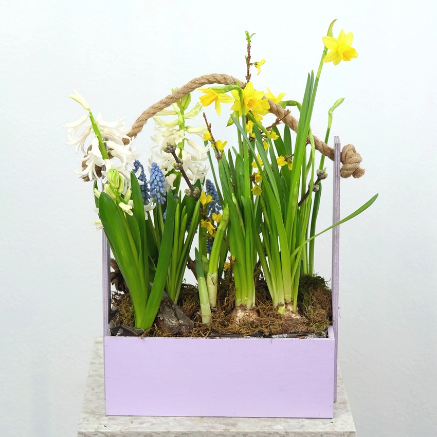Очаровательная композиция из луковичных первоцветов в деревянном ящичке. Весенняя композиция из гиацинтов, мускари и нарциссов.