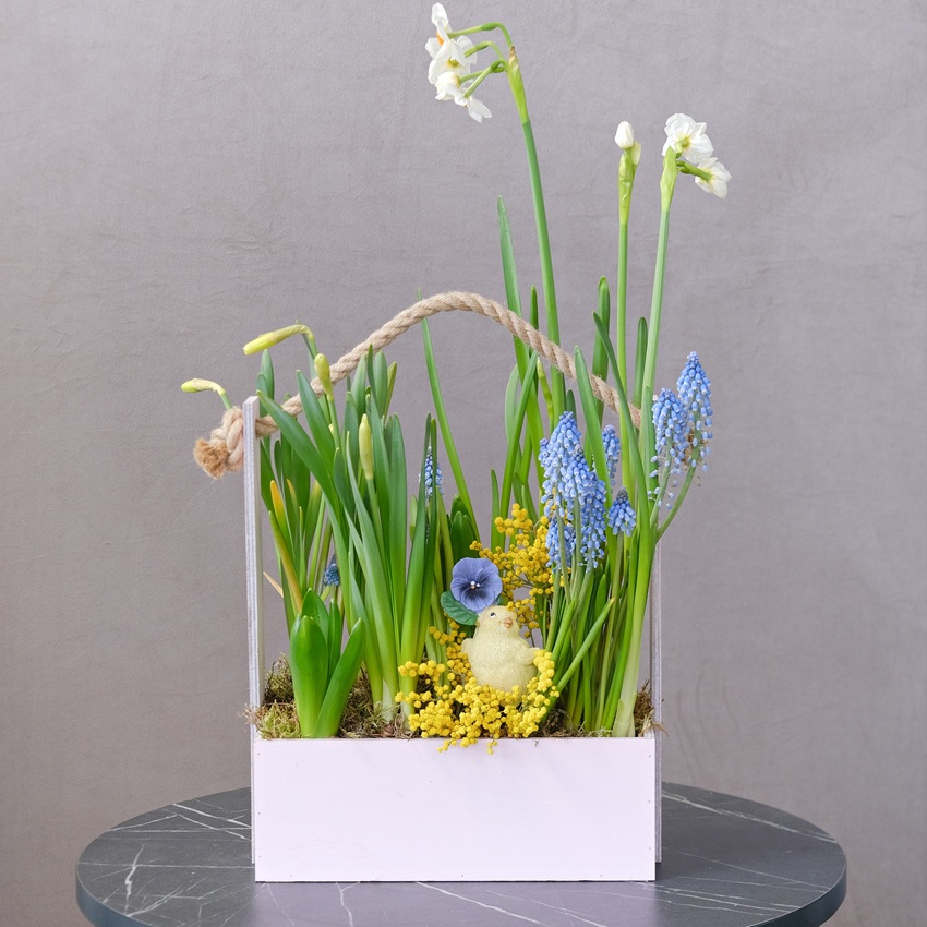 Цветущий садик в ящике: мускари, гиацинты и нарциссы с сувениром "Цыпочка"