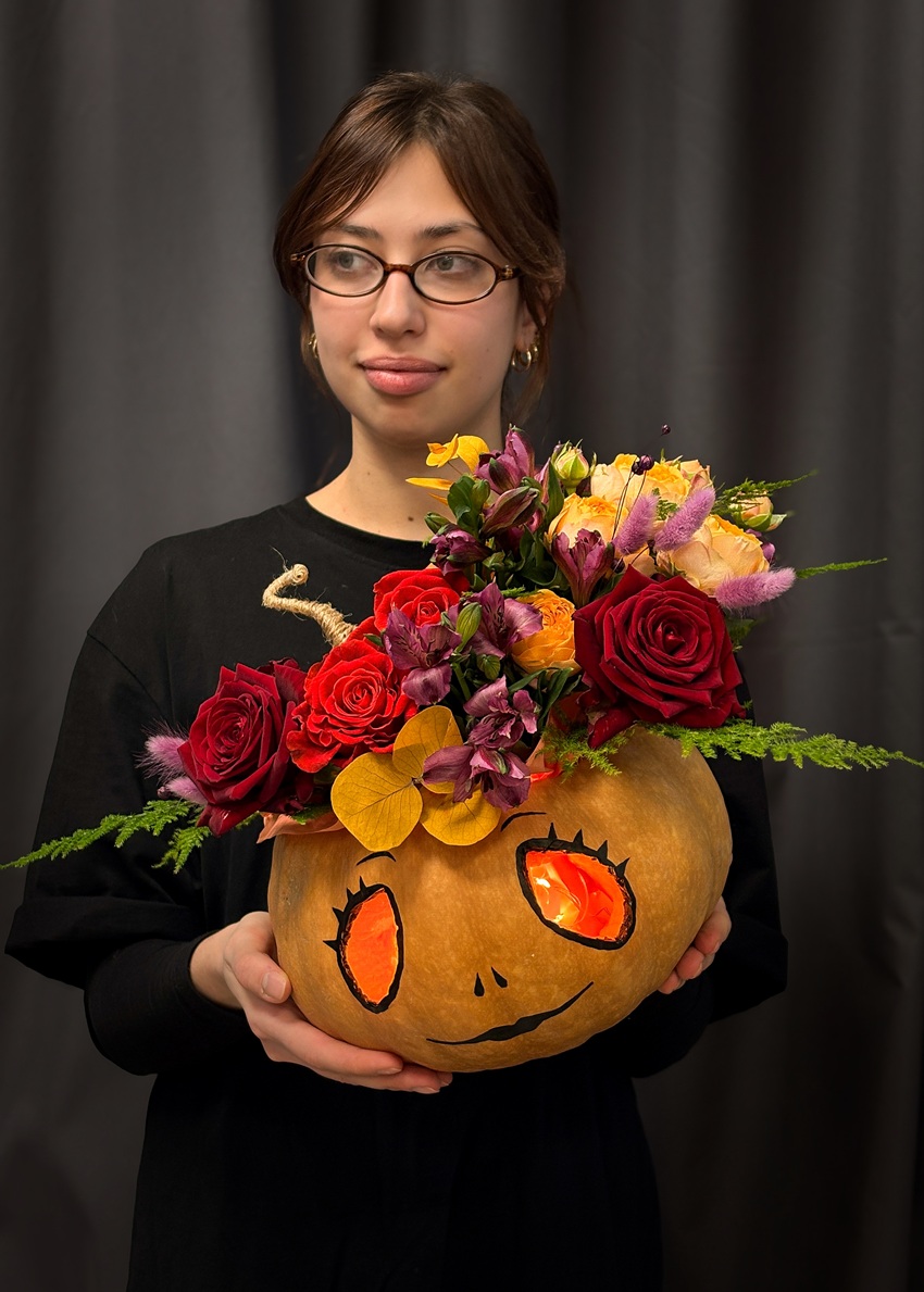 Букет собран в декоративной тыкве, цветы установлены в специальную флористическую пену - оазис. Необходим ежедневный полив.