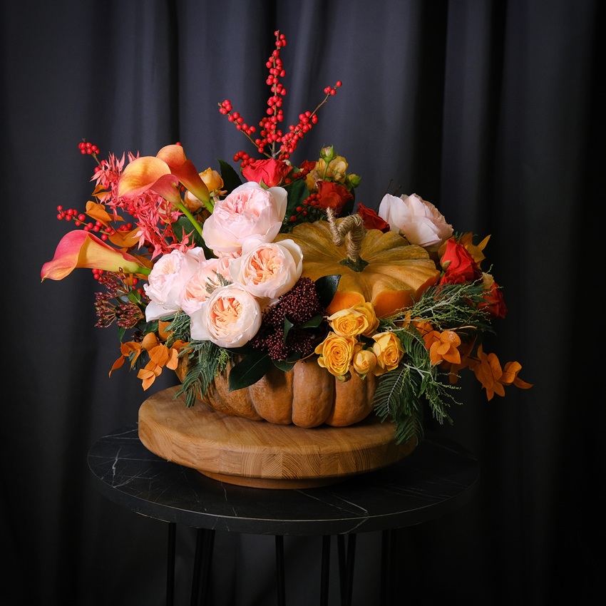 Цветы в тыкве! Тыква с каллами, пионовидными розами и ягодами илекса